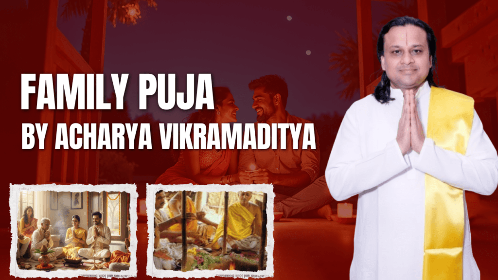 Family Puja is performed to seek divine blessings for unity, peace, protection, and happiness of the entire family.